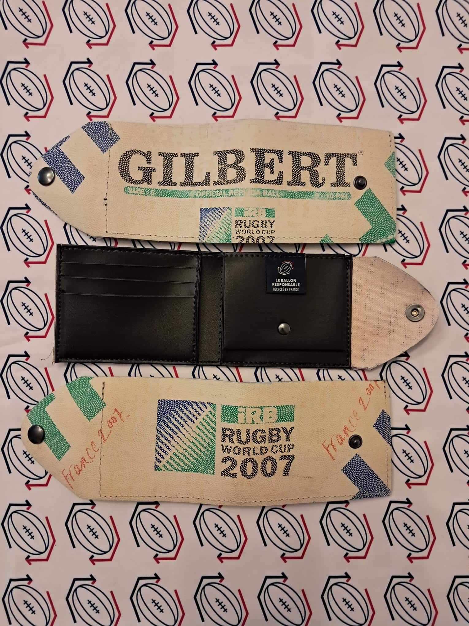 Fabriqué en ballons recyclés, chaque portefeuille affiche les couleurs d’une coupe du monde de rugby.