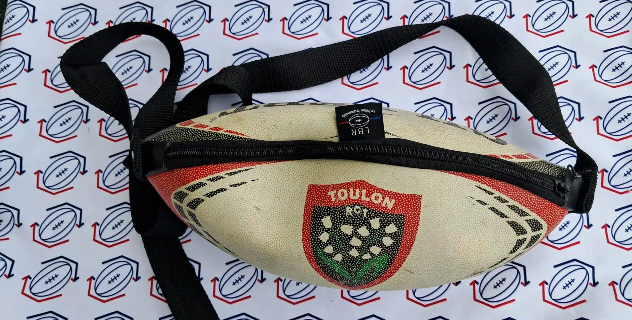 Affichez fièrement vos couleurs avec ce sac banane RC Toulon, fabriqué à partir d’un ballon de rugby recyclé.