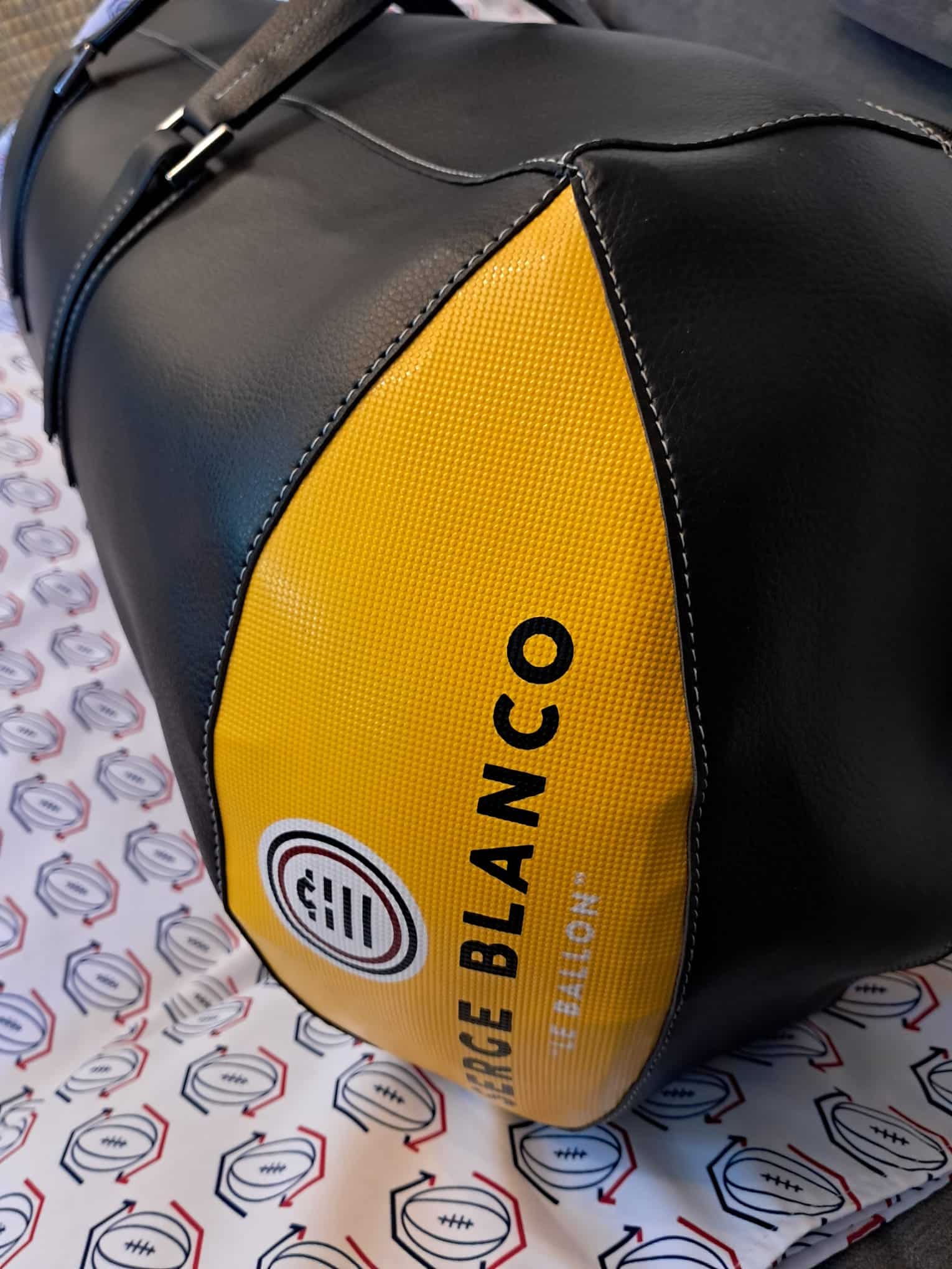 Sac de Luxe réalisé avec un véritable ballon collector SERGE BLANCO – RUGBY for cool people » : une création d’exception en ballon de rugby recyclé.