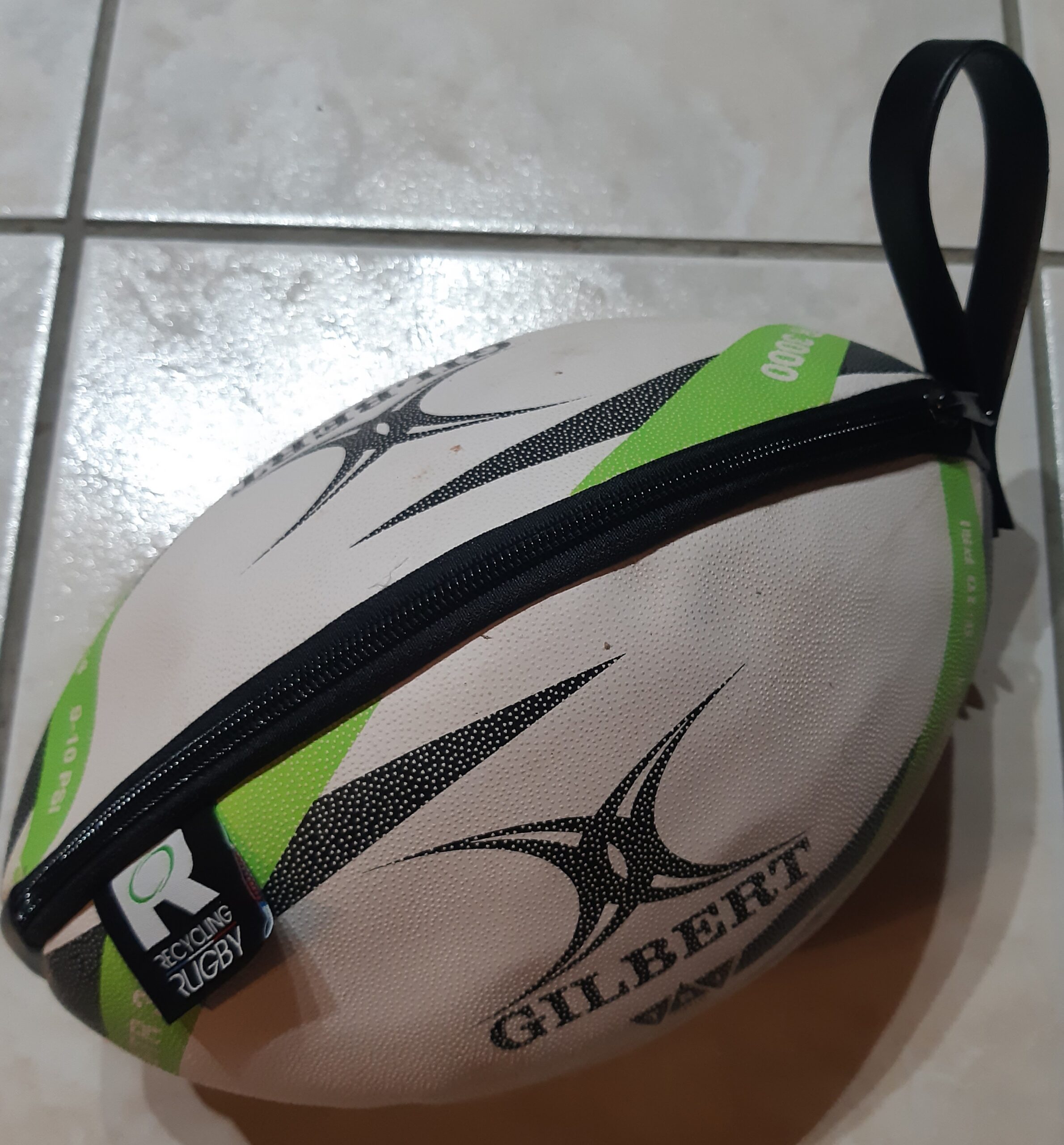Cette trousse de toilette est réalisée à partir d’un ballon Gilbert vert recyclé, symbole d’une démarche durable.