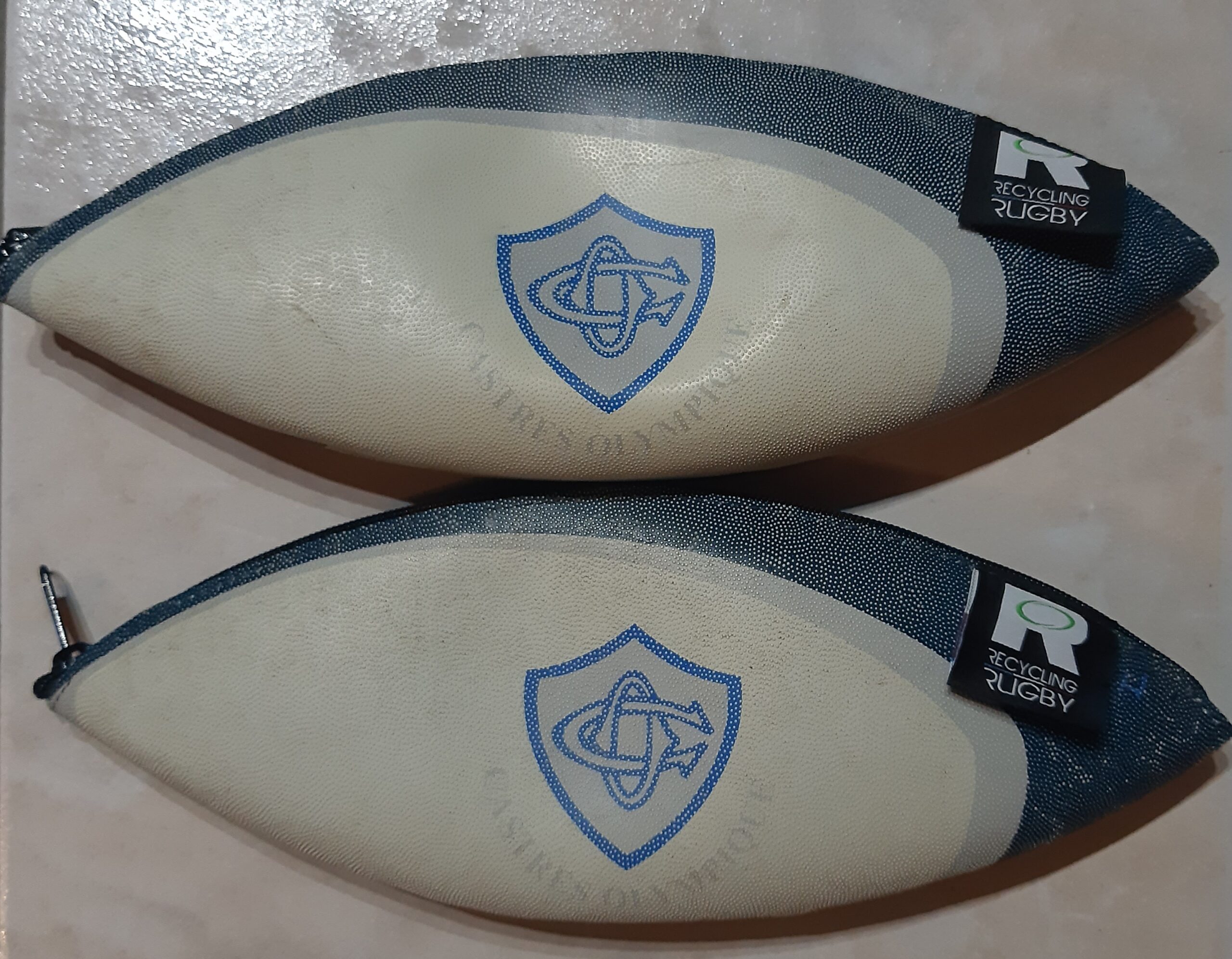 Offrez à vos enfants une trousse d’écolier unique, fabriquée à partir d’un ballon de rugby recyclé – modèle Castres Olympique.